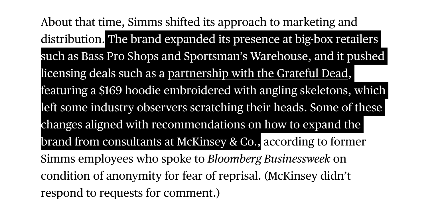 It was cool to see a big news org describing how the industry's relationship with Simms has soured. Andy Becker reported and wrote a solid story, pegged on a solid fly shop (Duranglers in Durango, Colorado) and the real-world troubles it's having with Simms, against the backdrop of its PE acquisition, and, ahem, challenges. And an interesting point arrived regarding the Grateful Dead collab. According to the article, classic PE-whisperers McKinsey were involved in making "recommendations on how to expand the brand" that included a tie-up with the band. So, our speculation that "do something with the Dead" is part of a playbook probably isn't that far off.